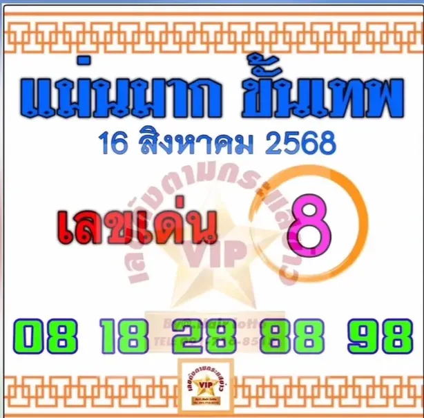 เลขเด็ด "แม่นมาก ขั้นเทพ" ชื่อนี้ก็การันตีถึงความแม่นยำ เลขดังขายดี มีแต่คนเฝ้ารอคอยกันอยู่มากมาย ให้เลขเด่นและเลขท้าย 2 ตัวแบบเน้นๆ ไม่มีกั๊กเลข สำหรับใครที่ยังไม่มีข้อมูล หรือลอตเตอรี่ ก็รีบนำเอาแนวทางเหล่านี้ไปใช้กันเราขอแนะนำ แต่ก็โปรดใช้วิจารณญานกันด้วยนะจ๊ะ เพราะว่าการเสี่ยงโชคย่อมมีความเสี่ยงตามมาเสมอ ควรศึกษาข้อมูลให้รอบคอบก่อนตัดสินใจซื้อ และซื้อตามกำลังที่ตัวเองมีโดยไม่เบียดเบียนตนเอง และผู้อื่น ทำแบบนี้รับรองโชคดีมาแน่ๆ ว่าแต่งวดนี้มีตัวเลขใหนบ้างที่น่าสนใจ พร้อมกันหรือยัง ว่าแล้วเราตามไปดูกันได้เลย