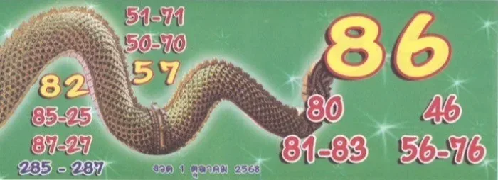 - เลขท้าย 2 ตัว : 51 - 71 - 50 - 70 - 85 - 25 - 87 - 27 - 80 - 46 - 81 - 83 - 56 - 76