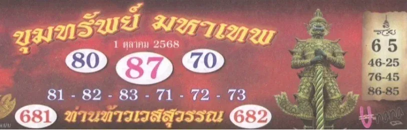 โดยแนวทางลอตเตอรี่ สำหรับ ‘ปฏิทินท่านท้าวเวสสุวรรณ’ งวดวันที่ 1/10/68 มีดังนี้
