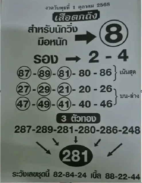 เลขเด็ด เสือตกถัง สูตร "อ.พล" งวดวันที่ 1/10/68 นี้ก็ได้ปล่อยทั้งเลขเด่น เลขดัง มาให้บรรดาคอหวยได้ไปพิจารณากัน สำหรับใช้เป็นแนวทางในการเสี่ยงโชคซื้อลอตเตอรี่ โดยงวดนี้มีเลขเด่น คือ 8 และรอง คือ 2 - 4 ส่วนตัวเลขในชุดอื่น ๆ ก็มีความน่าสนใจเป็นอย่างมาก สามารถไปดูที่ใบหวยด้านล่างกระทู้กันได้เลย
